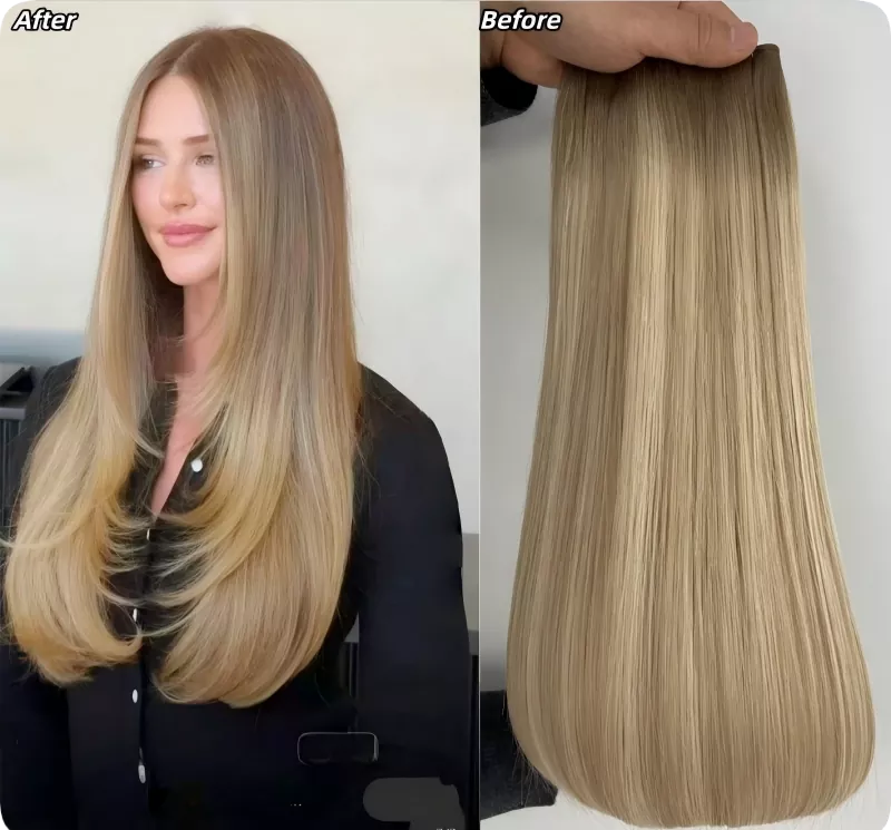 Na etapie „przed” pasma włosów miały gładką, prostą teksturę w odcieniach brązowo-blond. Jakość i połysk były już widoczne, odpowiednie do użytku profesjonalnego. Jednak „po” instalacji i stylizacji salonowej wygląd ewoluował w coś znacznie bardziej efektownego. Zwiększono objętość, poprawiono ruch, a mieszanie kolorów wydawało się bardziej naturalne.